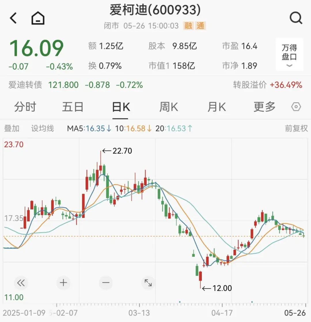 截至5月26日收盘,爱柯迪股价报收于16.09元/股,总市值为158亿元。