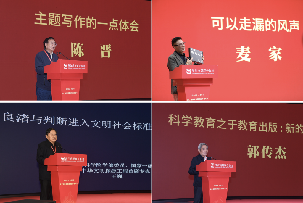 在主旨演讲环节,杰出作者代表、原中共中央文献研究室副主任陈晋以“主题写作的一点体会”为题,茅盾文学奖得主、中国作家协会副主席麦家以“可以走漏的风声”为题,中国社会科学院学部委员、中华文明探源工程首席专家王巍以“良渚与判断进入文明社会标准的中国方案”为题,国际欧亚科学院院士、国家教育咨询委员郭传杰以“科学教育之于教育出版:新的挑战与机遇”为题分别发表精彩演说,分享创作心得与行业洞见。大会期间,浙版集团还组织了新书首发、读者见面、图书签售、阅读分享等系列活动,回馈广大读者。