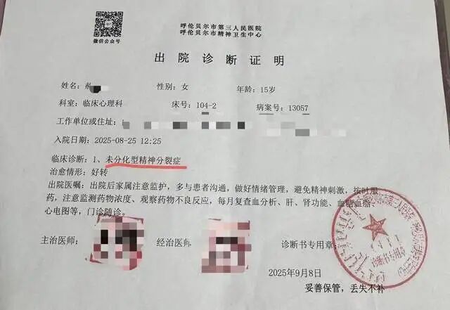8月25日,王女士筹了2万元,带小郝前往呼伦贝尔某精神卫生医院看病,病历显示,小郝被诊断为未分化型精神分裂症。