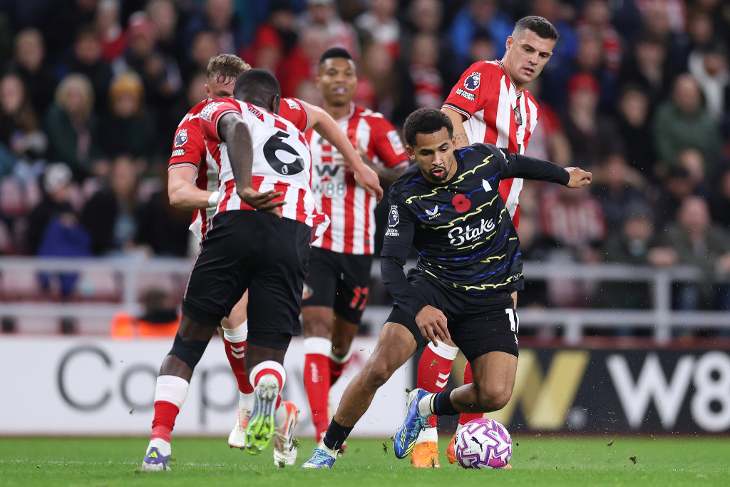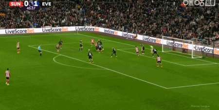 第46分钟,桑德兰扳平比分,埃弗顿禁区解围不远,左路弧顶扎卡跟上抽射破门,桑德兰1比1埃弗顿。