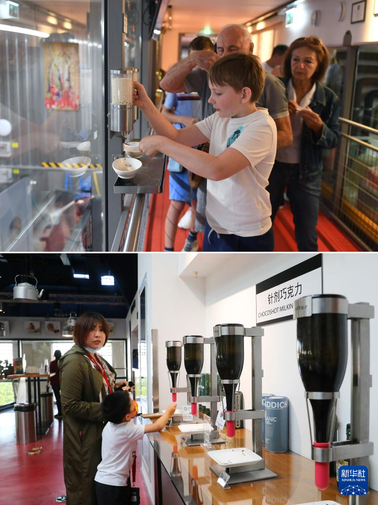 上图:2025年8月6日,游客在位于奥地利贝格尔的珍得巧克力剧院内品尝巧克力。新华社记者 贺灿铃摄 下图:2022年9月24日,在上海杨浦滨江的奥地利珍得巧克力剧院品尝区,游客查看巧克力食品。新华社记者 方喆 摄