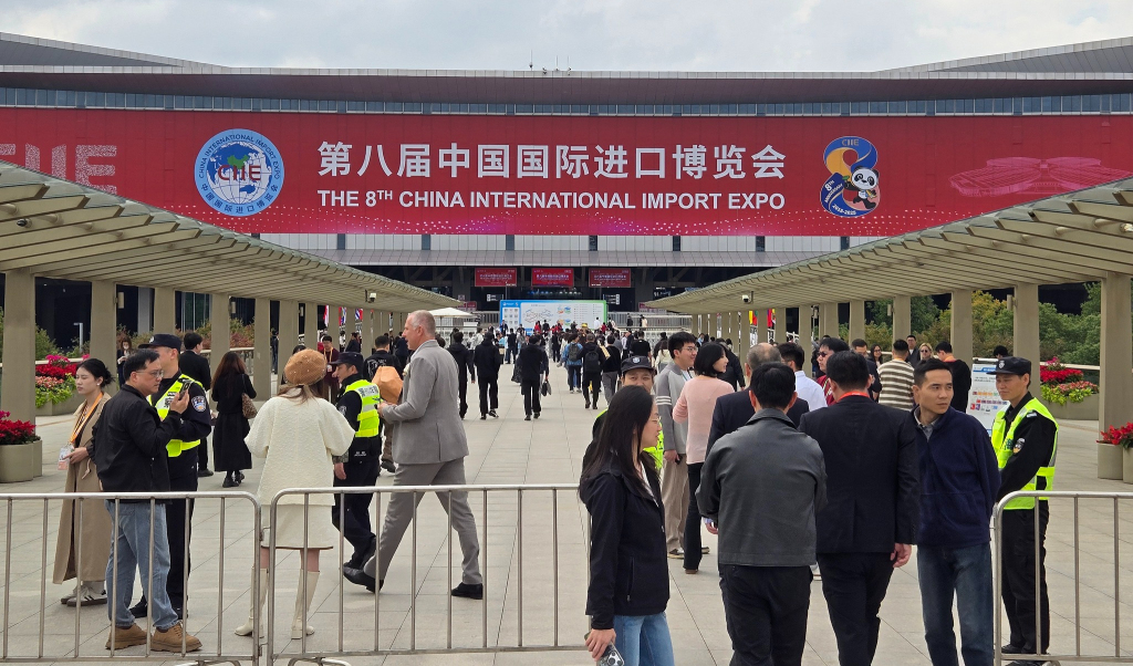 2025年11月5日,上海第八届中国国际进口博览会开幕,场馆外参观氛围浓郁。