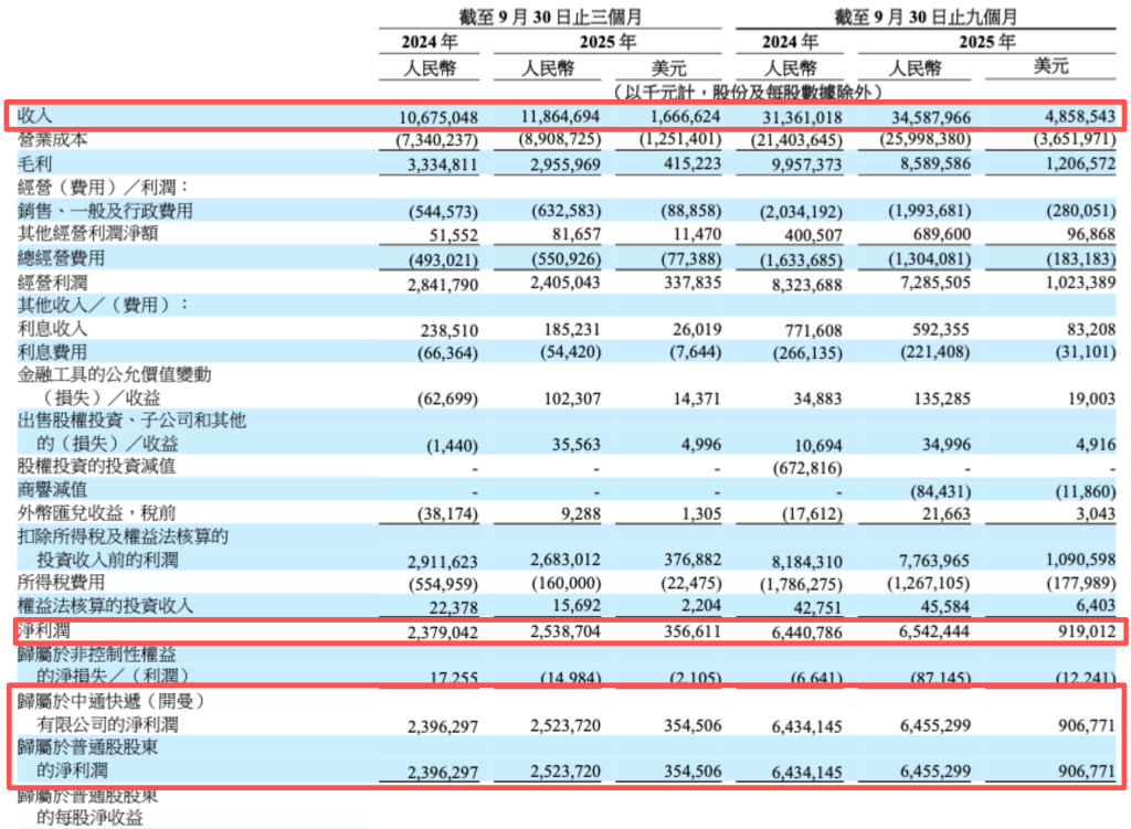 11月20日,中通快递(ZTO.N,2057.HK)公布2025年第三季度未经审计的财务业绩。财报显示,三季度实现营收118.65亿元,同比增长11.1%。其中,第三季度核心快递服务收入同比增长11.6%,增长是由于包裹量增长9.8%及包裹单价增长1.7%所致。