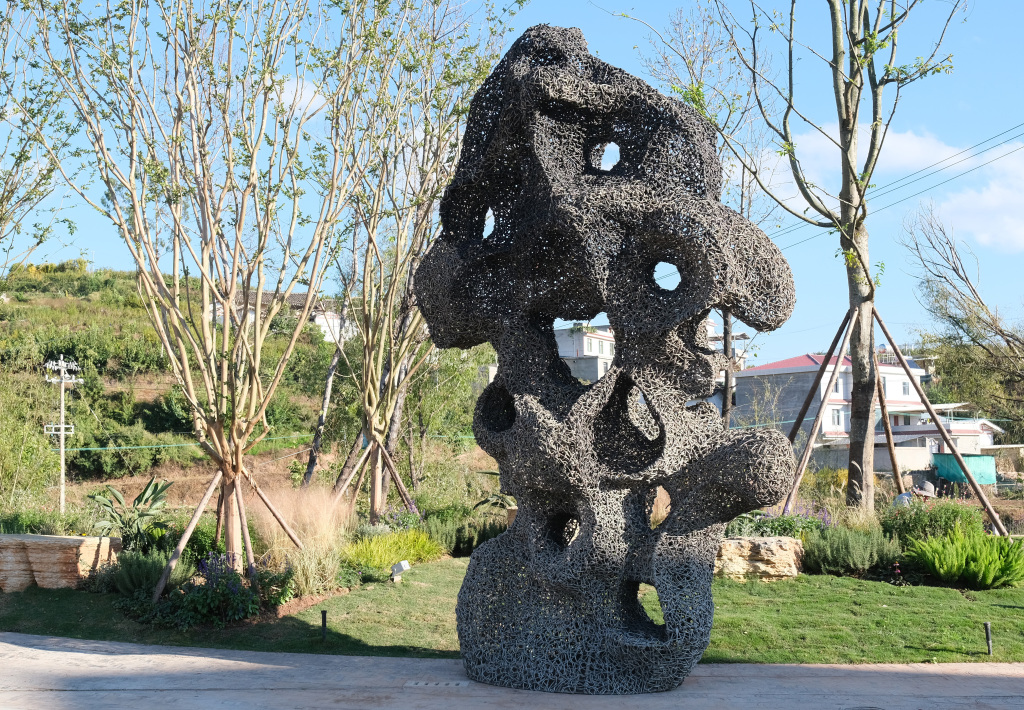 岳嵩的作品《云中石》以太湖石为灵感,但是通过编织工艺,以柳条呈现出“瘦、皱、漏、透”形态,仿佛一块从云端落入田园的奇石。柳条材质的自然肌理与稻田的农作物质感相呼应,传统太湖石的古典审美在田园场景中被赋予了新的解读。