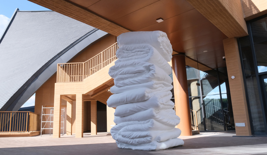 宿志鹏的《Honor the Sky》中,看似柔软的被子,粗略的整理和危如累卵式的罗列,支撑起强大的屋顶,这种模糊的多义性,引导观众主动关闭“常理”给我们灌输的看问题的模式,重新审视我们的生活。