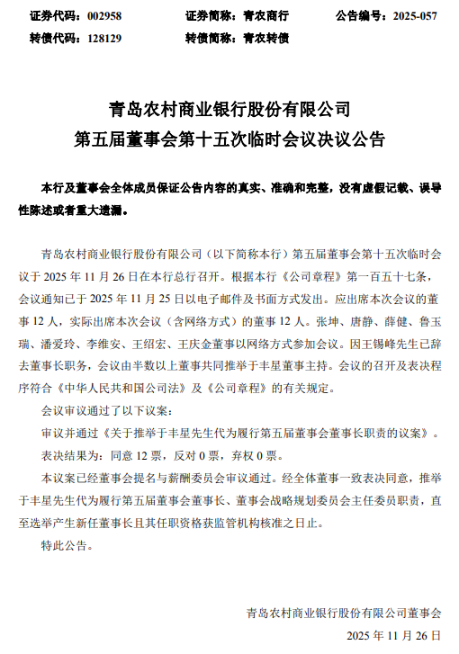正文 青农商行:董事长王锡峰到龄退休 于丰星代为履行董事长职责 亿通速配 V管理员 /2025-11-26 18:00:04/1阅读/0评论 1126 文章最后更新时间2025年11月26日,若文章内容或图片失效,请留言反馈! 11月26日金融一线消息,发布公告称,公司董事会近日收到董事长王锡峰提交的辞职报告,因到龄退休,王锡峰辞去公司第五届董事会执行董事、董事长等职务,辞职后将不再担任公司及控股子公司任何职务。王锡峰的辞职自辞职报告送达董事会时生效。 同日,第五届董事会第十五次临时会议审议并通过《关于推举于丰星先生代为履行第五届董事会董事长职责的议案》,推举于丰星代为履行第五届董事会董事长、董事会战略规划委员会主任委员职责,直至选举产生新任董事长且其任职资格获监管机构核准之日止。