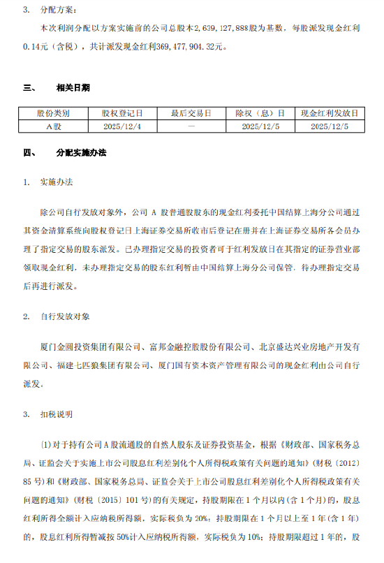 正文 厦门银行2025年半年度权益分派:拟每股派发现金红利0.14元 亿通速配 V管理员 /2025-11-26 18:15:05/1阅读/0评论 1126 文章最后更新时间2025年11月26日,若文章内容或图片失效,请留言反馈! 11月26日金融一线消息,公布2025年半年度权益分派实施公告,本次利润分配以方案实施前的公司总股本26.39亿股为基数,每股派发现金红利0.14元(含税),共计派发现金红利3.69亿元。 本次权益分派股权登记日为2025年12月4日,除权除息日为2025年12月5日。