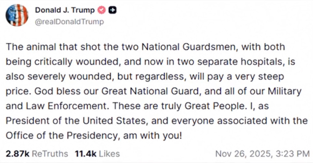 26日下午,部署到华盛顿特区的西弗吉尼亚州国民警卫队两名成员在距离白宫仅几个街区的地方遭到枪击。美国联邦调查局局长帕特尔随后在新闻发布会上说,两名受伤士兵情况严重,已被送医救治。