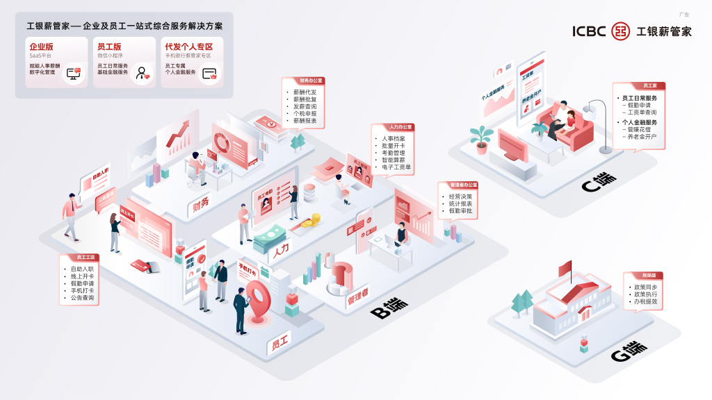正文 工银薪管家——企业及员工一站式综合服务解决方案 亿通速配 V管理员 /2025-12-08 11:15:03/5阅读/0评论 1208 文章最后更新时间2025年12月08日,若文章内容或图片失效,请留言反馈! 以薪酬服务为核心,聚焦“人事考勤+薪酬个税”业务场景,涵盖Saas云平台、员工小程序、手机银行专区三端,为企业及员工提供一站式综合薪酬服务解决,形成企业、员工和银行三端数据贯通、场景贯通、系统联通的智慧化服务新格局。