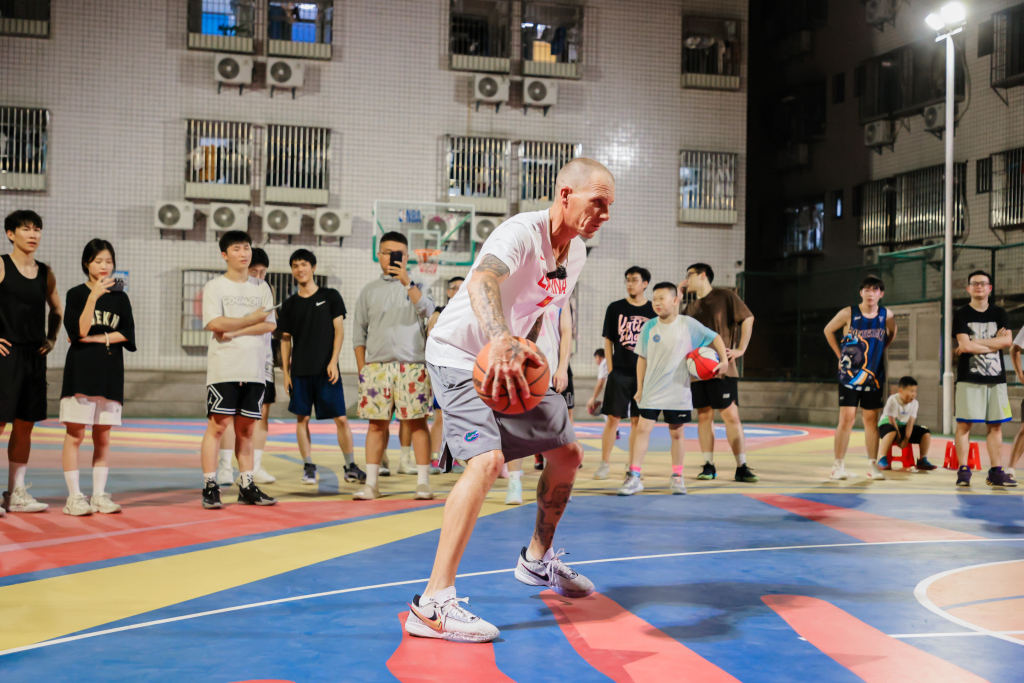 马垅社区城中村篮球场,美国NBA球星“白巧克力”贾森·威廉姆斯指导居民打球。 马垅社区 供图