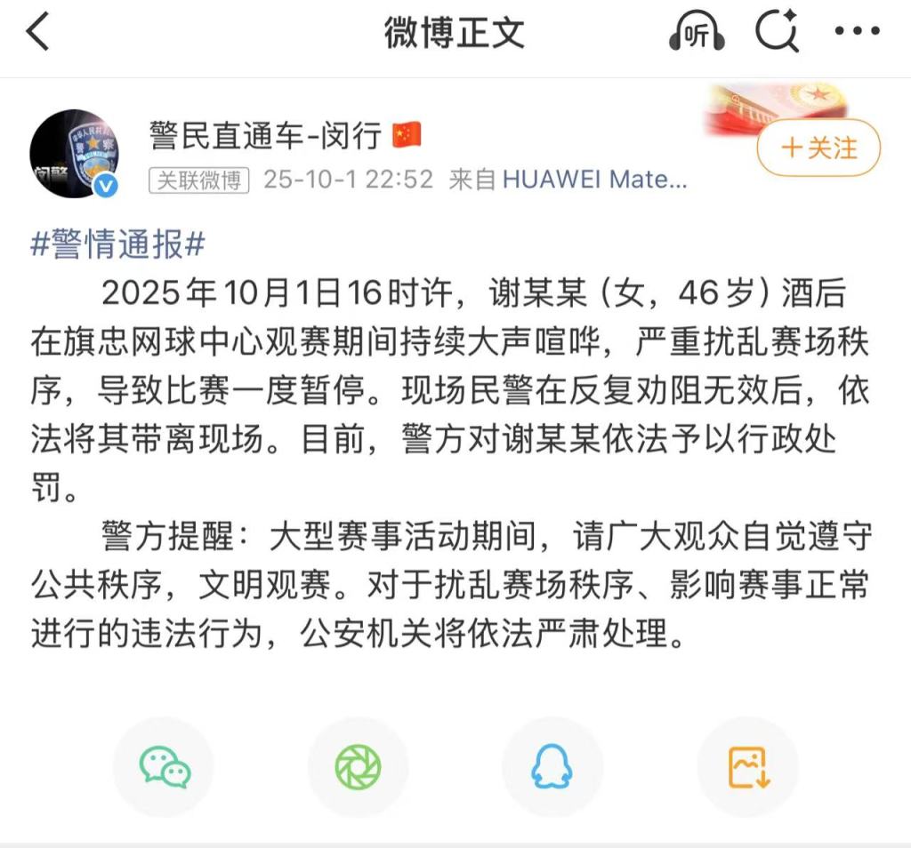 警方通报称:2025年10月1日16时许,谢某某(女,46岁)酒后在旗忠网球中心观赛期间持续大声喧哗,严重扰乱赛场秩序,导致比赛一度暂停。现场民警在反复劝阻无效后,依法将其带离现场。目前,警方对谢某某依法予以行政处罚。
