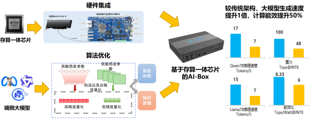 针对存算一体器件、电路非理想特性导致精度鲁棒性低的问题,提出一种面向存算一体芯片的AI模型协同精度优化方法,在模型训练阶段引入存算一体芯片上的推理结果进行反向传播并更新模型权重,基于该方法优化的图像识别算法准确率提升10%。