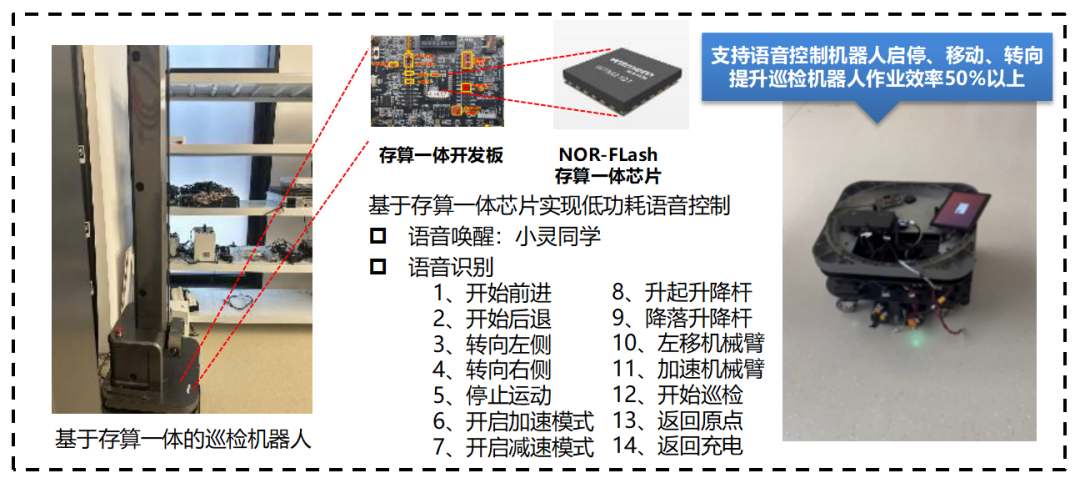 在NOR-FLASH方面,中国移动联合知存科技将存算一体芯片应用到智能巡检机器人场景,基于“芯易”存算一体软件计算引擎实现轻量化语音AI模型在WTM2101 NOR-FLASH存算一体芯片的协同精度优化和自动化编排,支持语音控制机器人启停、移动、转向,提升巡检机器人作业效率50%以上。