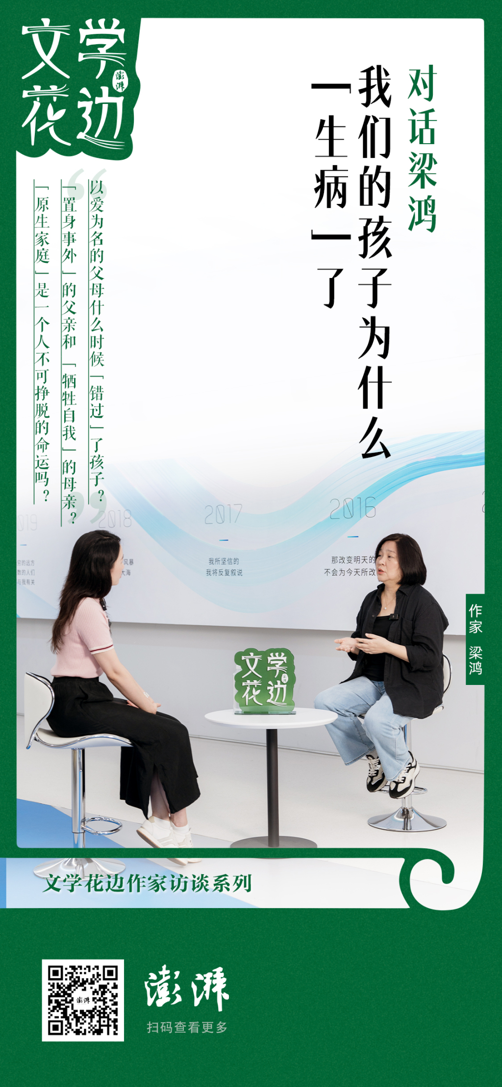 孩子们为什么“生病了”?以爱为名的父母是在什么时候“错过”了自己的孩子?为什么我们常常看到一个“置身事外”的父亲和一个“牺牲自我”的母亲?“原生家庭”是一个人不可挣脱的命运吗?……在新作出版之际,梁鸿接受了澎湃新闻·文学花边独家专访。