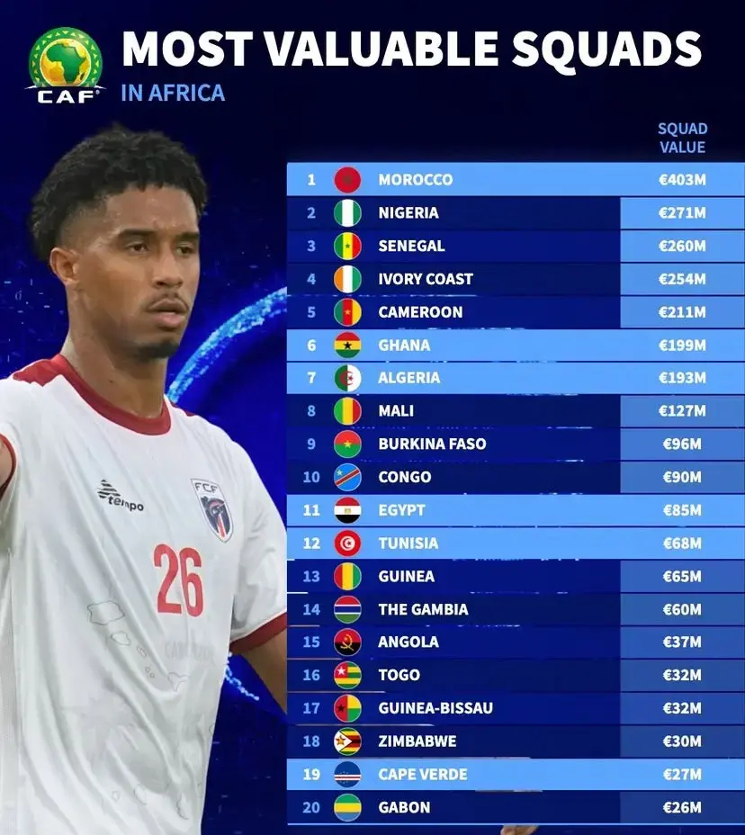 佛得角全队身价仅为2700万欧元,在非洲排名第19位。