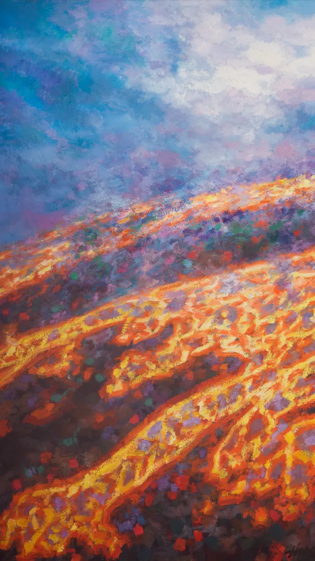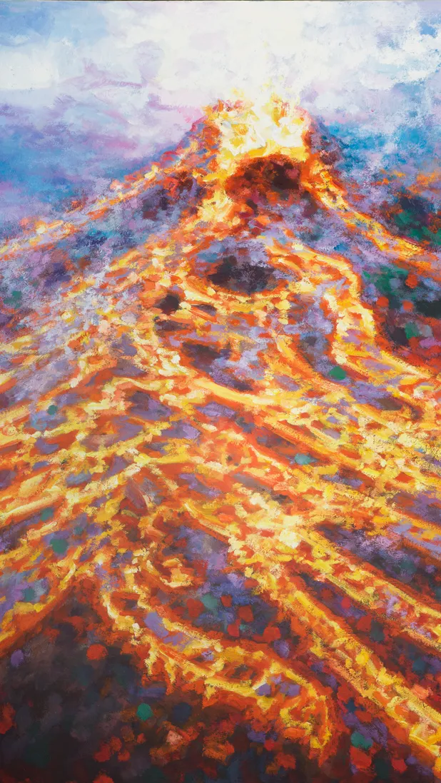 展览匠心独运地分为“火舞锦缠”与“云山苍茫”两大篇章。 “火舞锦缠”源于艺术家在今年乙巳年新春的创作灵感,灵感来自冰岛火山的喷发之势与“木火相生”的东方传统哲思。俞中保以绘画的画笔为媒介,融合金、木、水、火、土五行共生的和谐场域,展现宝矿的积蓄、森林的繁茂、云的温暖、火山的热烈。