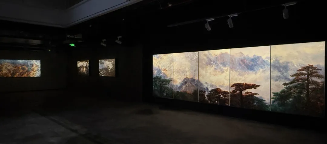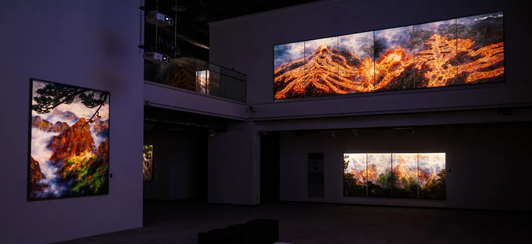 展览充分利用了静安雕塑公园艺术中心的展厅空间,通过灯光、音效与作品的有机融合,为观众营造了沉浸式的观展氛围。结合《火舞锦缠》作品,制作了高7米,宽4米的数字影像艺术作品,巨幅投影覆盖了两层展厅,火山的岩浆随着艺术家的笔触流动起来了,仿佛身临其境。展览将延续至2026年1月18日。