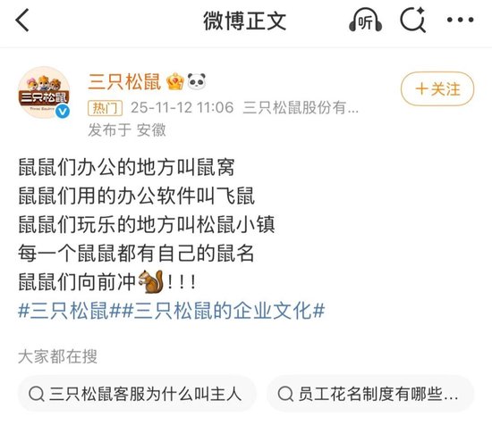 针对争议,三只松鼠方面对外回应,“鼠名”是非强制性企业文化,仅用于内部工作场景。据媒体报道,入职时三只松鼠会告知员工可自主选择取“鼠”字开头名字作花名,但并非硬性规定,拒绝取用不会产生任何不良影响。“这种命名方式是为了更好地契合‘三只松鼠’的品牌形象,让内部工作氛围更显亲切,同时强化品牌特色。”创始人章燎原的花名“松鼠老爹”便是典型例子,员工也有“鼠标垫”“鼠键盘”等趣味名称。此外,即便员工后续离职,公司也会为其保留对应的“鼠名”,作为曾在企业工作的纪念。