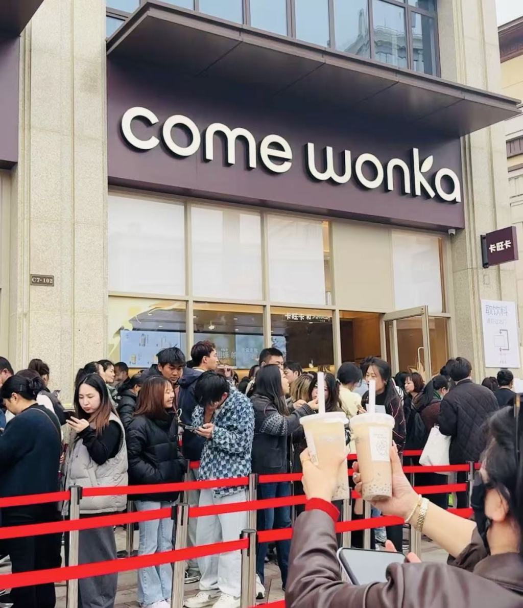 很快,一个半小时后,她们出现在了广德绥安路,这里有广德的其中“两件套”——卡旺卡奶茶和詹记桃酥,两家门店相距不过50米,但每家门口都排起了一两百米的长队。跟她们一样,很多人也是从长三角其他城市早早出发奔向广德。