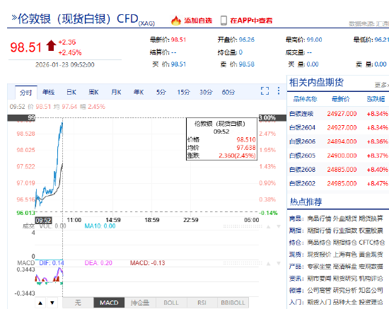 正文 快讯:现货白银首次突破99美元/盎司关口 新年首月涨超38% 亿通速配 V管理员 /2026-01-23 09:55:03/3阅读/0评论 0123 文章最后更新时间2026年01月23日,若文章内容或图片失效,请留言反馈! 热点栏目 北京时间1月23日上午,现货持续走强,首次突破99美元/盎司关口,新年首月涨超38%。 新浪合作大平台期货开户 安全快捷有保障